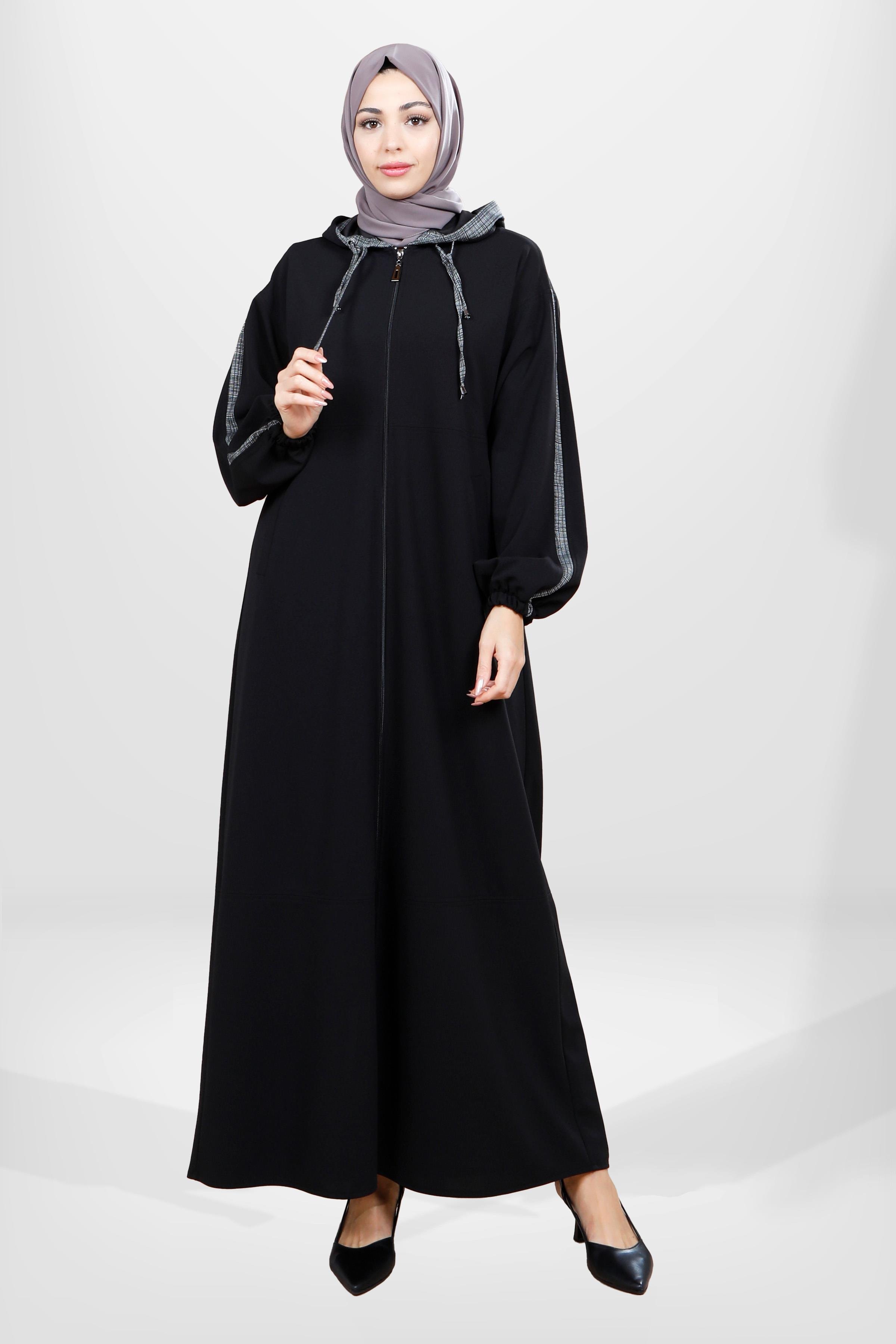 Astarsız, kapşonlu ve yan cepleri olan, iplerinde ve kol şeridinde garnisi olan siyah ferace.